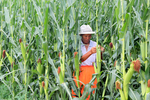 8月8日,原平市东野庄村农民正在查看长势喜人,颗粒饱满的玉米棒子,入秋,该市田野上大秋作物长势喜人,到处是一派丰收景象,农民们高兴地说,今年又是一个好年景好收成。(赵春晓 摄)