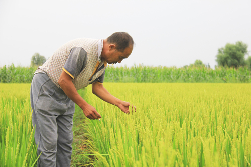 8月13日,原平市大库狄村民王财旺正在稻田里查看长势。山西省原平市大库狄村依傍滹沱河不缺水的优势,发展水稻特色种植,生产的优质大米成为品牌,商家客户上门收购,富了村民。预计今年亩产可达到千斤。(吉建平 摄)
