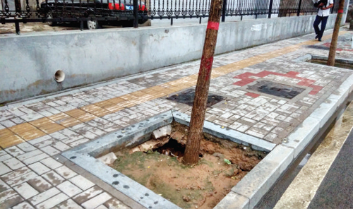 8月14日,记者在城区建设南路与长征西街交汇处往南不远处发现,人行道一棵树栽种区内有一个破洞,并且有往左侧延伸的趋势,在雨水的冲击下可能会对树木和周围道路造成影响,希望相关部门能够重视,做到防患于未然。(许净 摄)