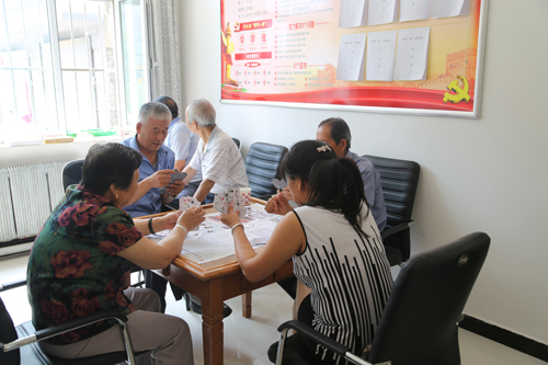 8月8日,在静乐县鼓楼社区内,老人们聚在一起打扑克、拉家常,每个人的脸上都洋溢着笑容。为丰富社区老年人的文化生活,近年来,静乐县不断加大老年人文化建设投入力度,在社区建立老年活动中心,提升老年人的生活质量。(闫晓梅 摄)