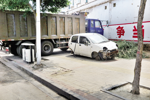 附近的居民们称,人行道本来就不宽,这样的“僵尸车”长年累月停放在路边不仅有碍观瞻,而且对市民的出行造成了不小的影响。记者认为,这些“僵尸车”如果废弃不用的话,就该进行报废处理,而不是一直停放在路边。希望车主能够尽快现身对车辆进行处理,同时也希望交警部门能够加大监管执法力度,让“僵尸车”的身影不再出现在街头巷尾。图为废弃的汽车。(王君 摄)
