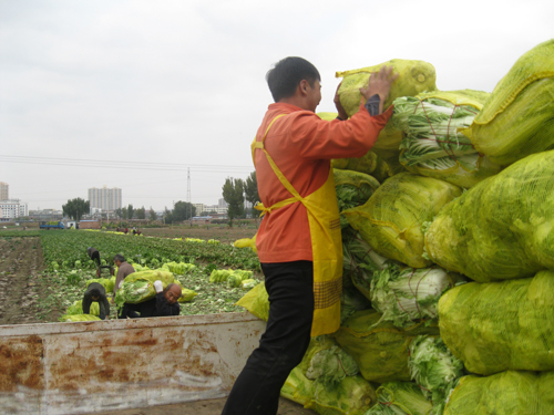 10月23日,河曲县南园村大白菜种植户忙着砍白菜、撕老帮、装袋子,帮助内蒙古准格尔旗、伊金霍洛旗和本县沙泉乡的客户装白菜,热闹中洋溢着丰收的喜悦。该村充分利用土肥水富、交通便利等优越条件,大力发展蔬菜产业,形成了“一村一品”产、供、销格局,成为晋陕蒙交汇地区蔬菜基地。特别是近千亩优质大白菜深受县内外经销商和消费者青睐,每年霜降前后,周边市县前来购买的菜贩络绎不绝。(贾金理摄)