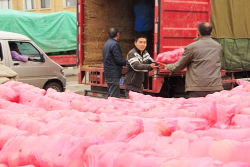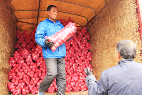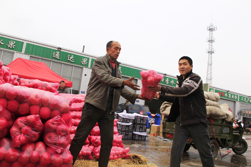10月23日,原平市果农正在德金城农产品交易市场卸货,进行销售。原平市着力打通农产品销售渠道,通过创建市场、加强管理,将当地农产品规范到统一销售场所,抱团销售农产品,不仅方便了消费者,而且便于走出去,打造知名品牌。(吉建平 摄)