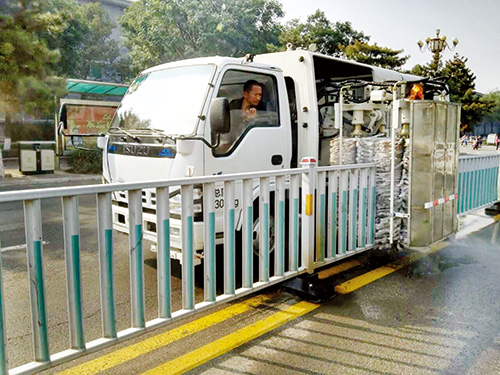 交通护栏可为市民、车辆出行提供安全保障,可人工清洗护栏工作耗时耗力,还存在安全隐患。新购置的护栏清洗车通过伸缩刷子以及车载水箱喷出的水流,完成护栏清洗,工作效率远远高于人工清洗,省时又省力,效果还明显。图为清洗车正在对城区交通护栏进行清洗。(张志远 孙明 摄)