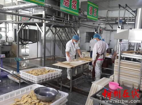 一套套全新的机械设备不停地运转,新鲜的大黄豆经过浸泡——杀菌——磨浆——过滤——煮浆——混合——凝固——划脑——压制成型,透着香味的豆腐干经过真空包装,通过物流运往北京、太原、大同等地的超市,这是繁峙县绿源亨通食品有限公司豆腐干生产线,2016年已加工500吨豆腐干,实现产值500万元,带动周边上百名农民增收。(乔伟 摄)