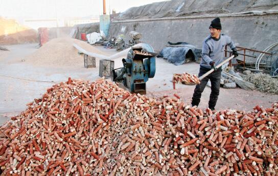 12月14日,原平市文殊庄村菇农正在将玉米芯粉碎装菌袋。该市积极引导农民利用玉米芯、锯末、麸皮等废料为基料,发展食用菌种植,并通过成立食用菌种植专业合作社、引进龙头企业进行规模化、产业化经营,使当地农民走上发展食用菌种植的致富路。(褚震 摄)