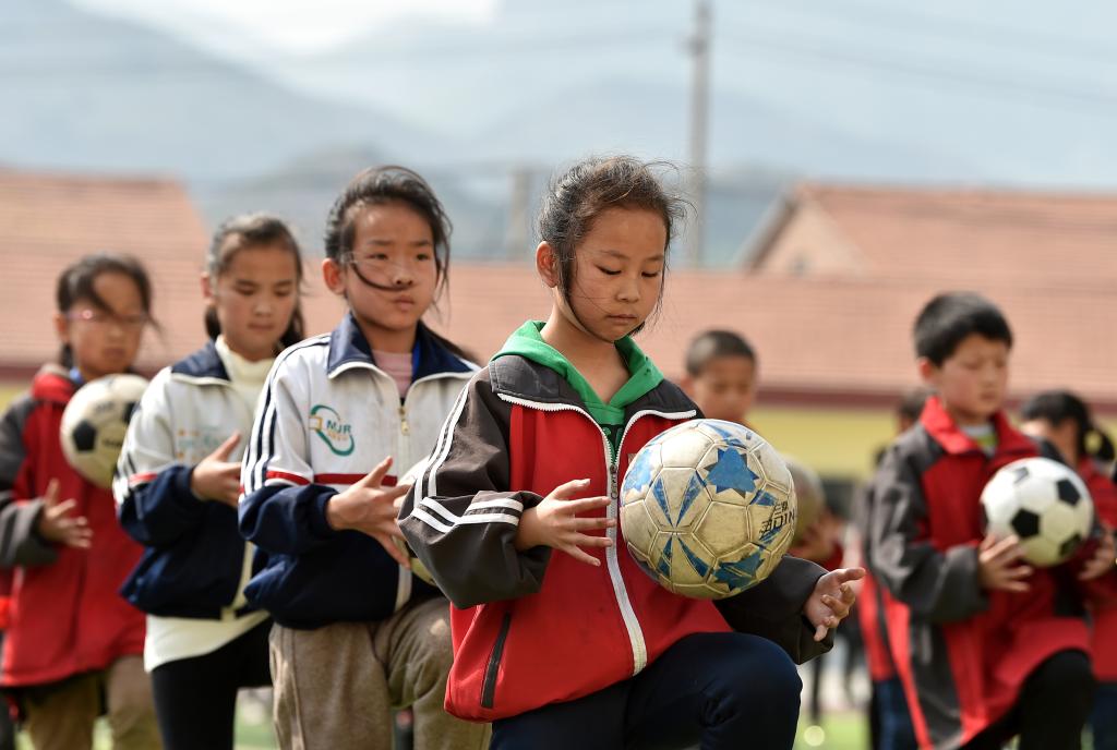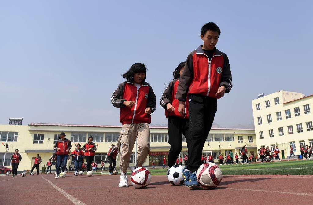 ↑这是学生们在练习带球(4月18日摄)。新华社记者李俊东摄