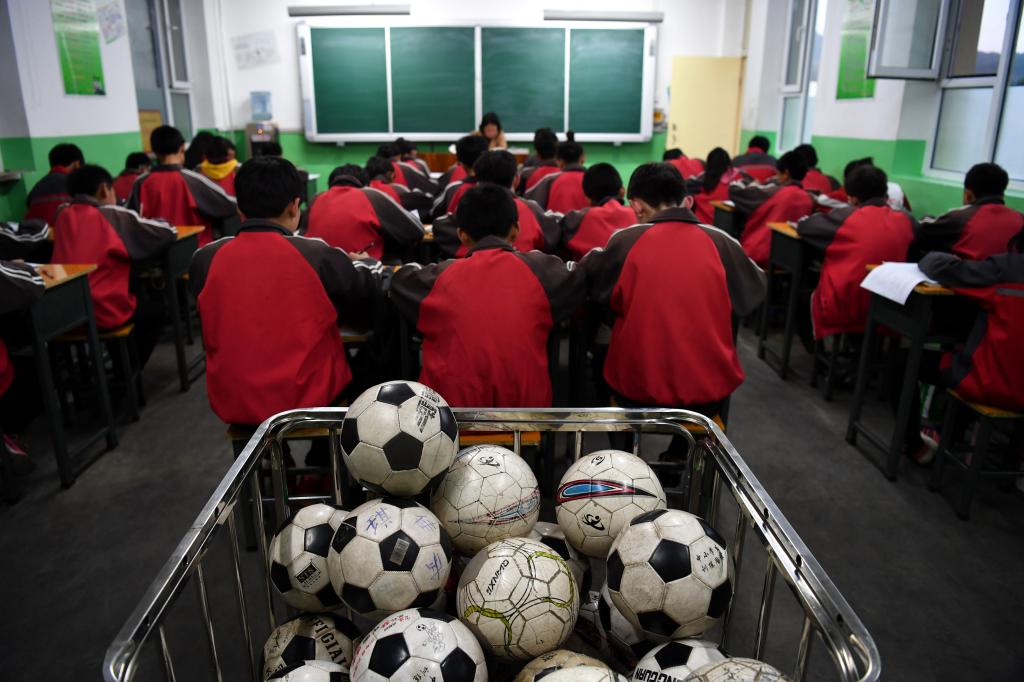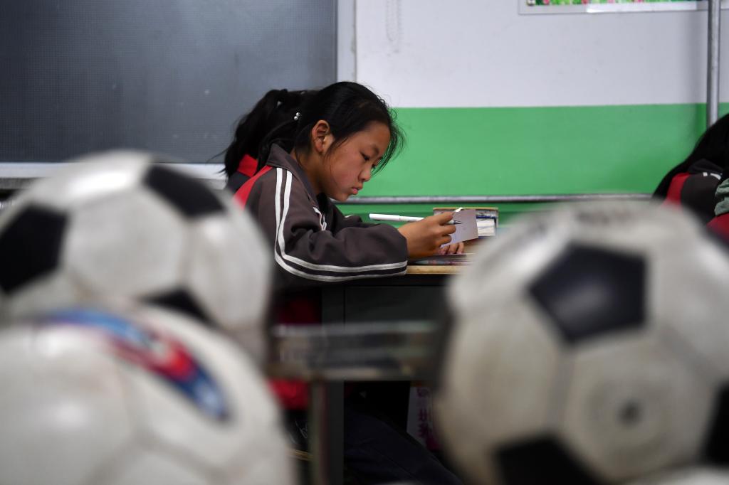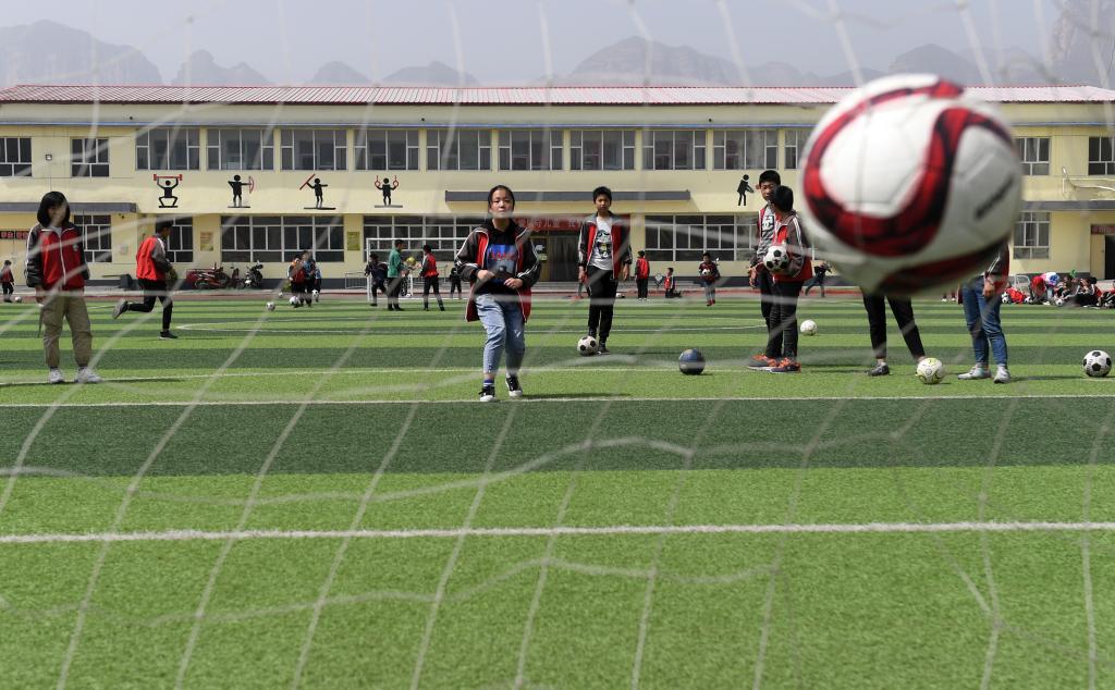 ↑这是学生们在体育课上进行射门训练(4月18日摄)。新华社记者李俊东摄