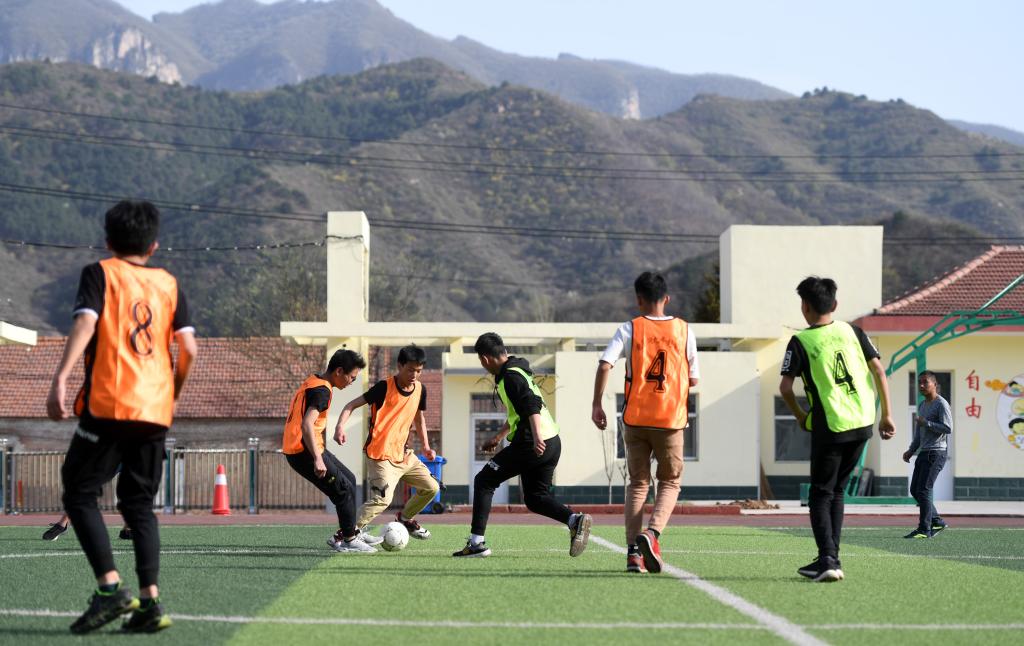 ↑这是初中组男子足球队队员在进行分组对抗赛(4月17日摄)。新华社记者李俊东摄