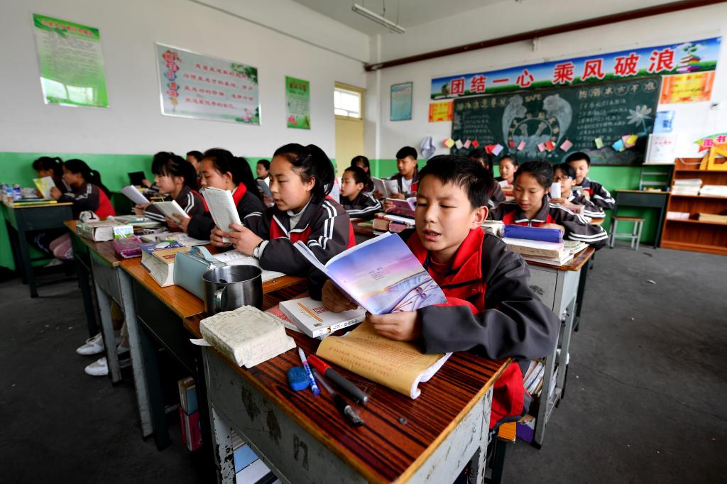 ↑这是初一121班的学生们在课堂上朗读课文(4月18日摄)。新华社记者詹彦摄