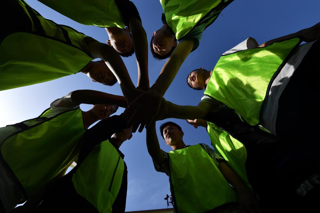↑这是初三116班的足球队队员在比赛开始前为自己加油鼓劲(4月17日摄)。新华社记者詹彦摄
