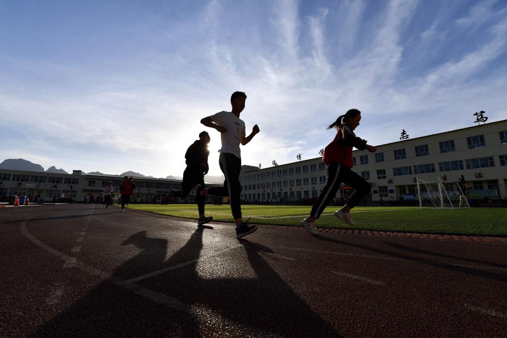 ↑这是学生们在跑步进行体能训练(4月16日摄)。新华社记者詹彦摄