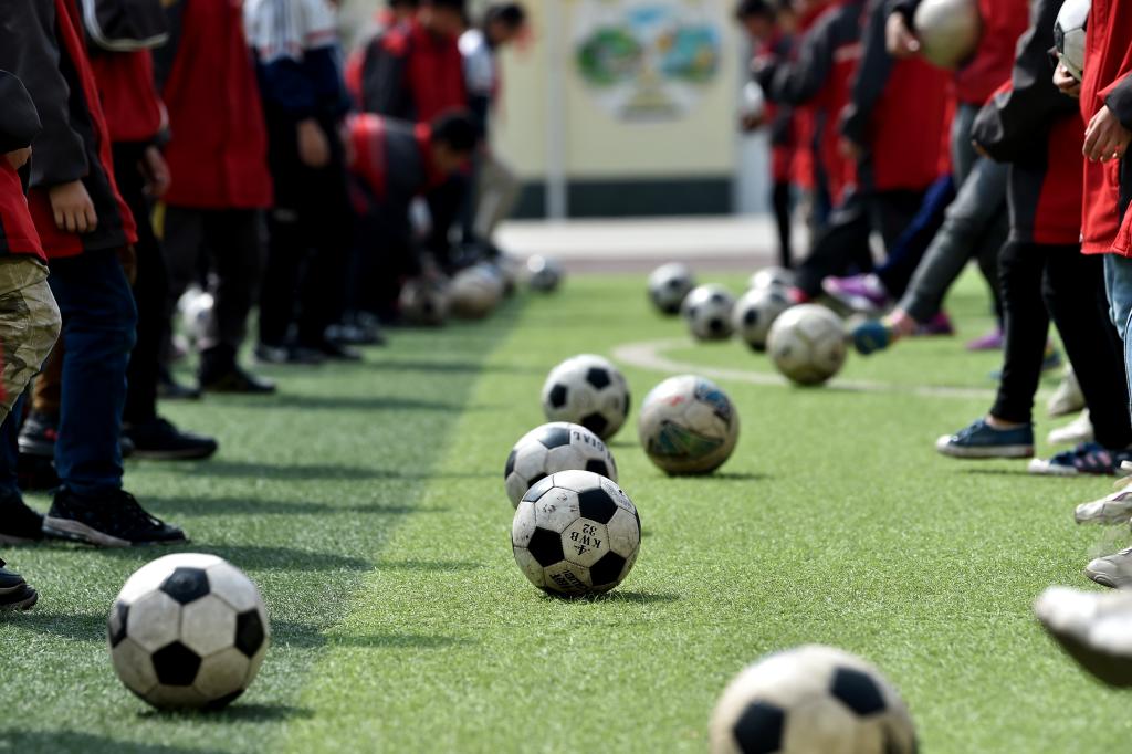 ↑这是学生们在练习传球(4月18日摄)。新华社记者詹彦摄