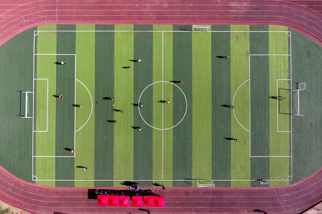 ↑这是初中组男子足球队队员们在进行分组对抗赛(4月17日无人机拍摄)。新华社记者詹彦摄