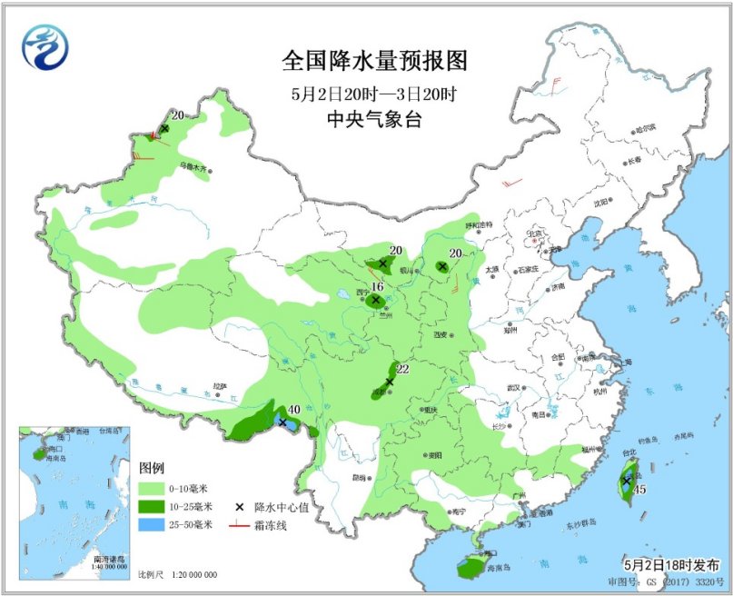 5月2日20时至3日20时,新疆西部、青藏高原中东部、西北地区中东部、内蒙古西部、西南地区北部和东部、华南南部、台湾岛等地有小到中雨,其中,西藏东南部、海南岛南部、台湾岛中部等地局地有大雨或暴雨(见图1)。新疆西部、内蒙古东部等地有4~6级风,新疆山口地区风力可达8~9级。