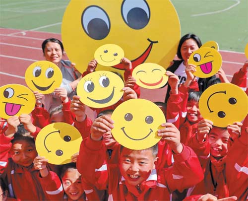 5月7日,各地学校举办丰富多彩的“微笑”主题活动,迎接5月8日世界微笑日的到来。图为河北省秦皇岛市河东小学的学生在展示笑脸卡。