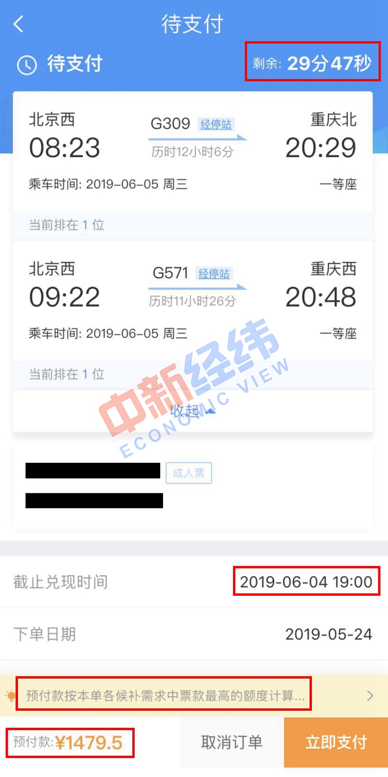 5、支付候补订单。值得注意的是,候补订单的支付需要在30分钟内完成,预付款按本单各候补需求中票款最高的额度计算。如果候补成功(即在兑现时间前抢到车票),预付票款中多出的部分,将自动退回差额给原账户;如果候补购票失败(即在兑现时间前未抢到车票),预付款将全额退回。