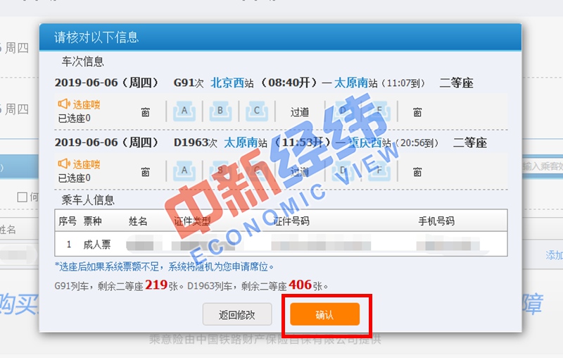 4、一切准备就绪后,就可进行车票预订了。点击“预订”后,系统会再次对换乘信息进行提示,确认无误后选择对应车次所需席别,添加乘车人信息。
