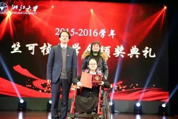 竺可桢奖学金是浙江大学最高层次的奖学金,要通过本人申请,学院(系)推荐,校奖学金评审委员会评定,每次评选全校范围内的研究生只有12个名额。在2016年10月份公布的获奖者中,叶沈俏名列其中。“自己算比较幸运的,还能看书,可以打字。”叶沈俏说,“同学和老师还是很关爱我的,努力学习、认真科研是向他们表达感谢的手段,这也是我最好的兴趣。”图为浙江大学校长吴朝晖为叶沈俏颁发竺可桢奖学金。