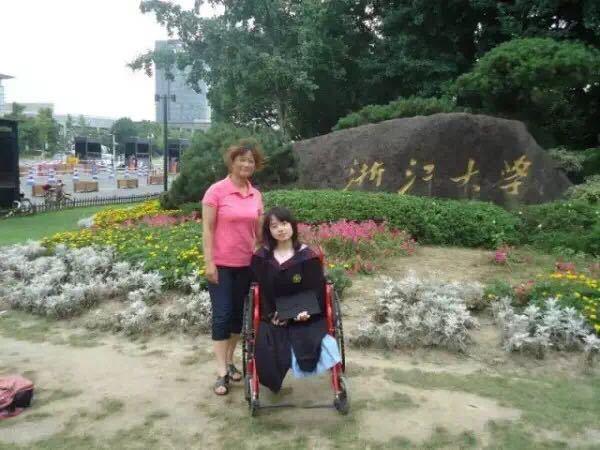 高考时,叶沈俏以全省名次靠前的优异成绩,被浙江大学录取。如愿被浙大录取后,那年初秋,叶妈妈就开始背着叶沈俏穿梭在浙大紫金港校区各个教室上课。“我妈妈是我的一个勇敢的榜样,身体力行地告诉我,我可以依靠自己的努力做一个独立有价值的人。”叶沈俏说。2010年的一次期末考试后,天空正在下雪,越来越大,别的同学早已急匆匆地考完试回家。地滑路湿,叶妈妈便穿上雨衣推着轮椅慢慢走在浙大校园里。叶沈俏说:“那一刻我觉得自己是最幸福的人,我不能放弃,而要更加努力。”图为叶沈俏本科毕业时与母亲的合照。