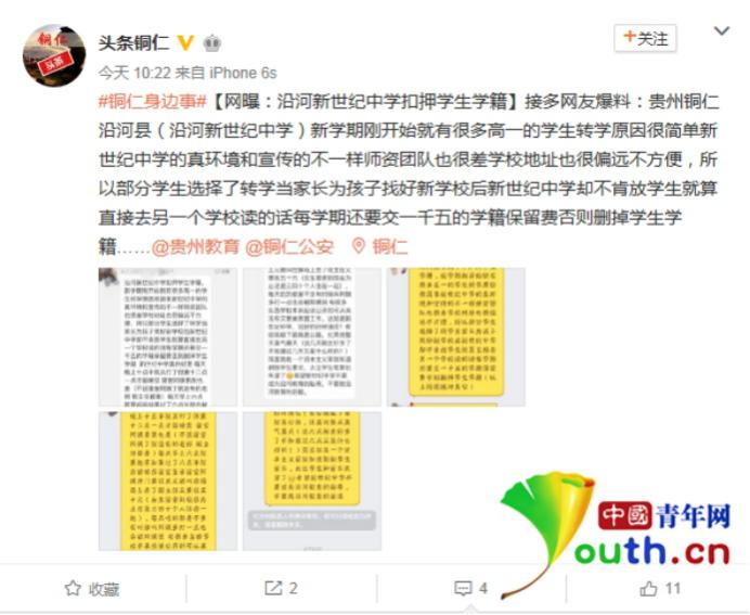 昨天有网友爆料称贵州省铜仁市沿河新世纪中学对想转学的学生收取近万元的“学籍保留费”,否则便注销学籍。昨天下午,沿河县新世纪中学常务校长罗元庆告诉中国青年网记者称,此项收费是当地不成文的规矩。