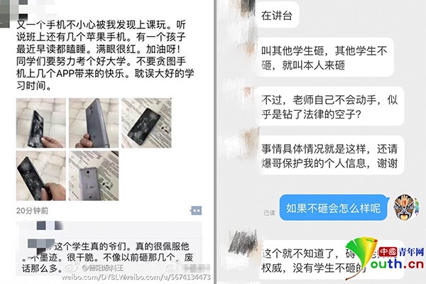 中国青年网北京2月28日电(实习记者 崔楠 记者 李永鹏) 近日,有网友发微博反映德阳一中学老师发现学生上课玩手机后要求学生自行将手机砸坏,事后发朋友圈赞赏该同学“真的爷们。很佩服他”。中国青年网记者致电四川省德阳中学政教处,值班老师告诉记者,将手机砸毁的处理方式肯定欠妥,如查明情况属实校方将在了解相关情况后进行处理。