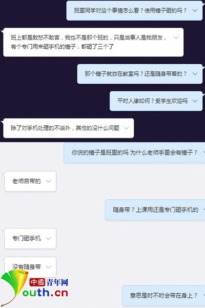 另一位目睹当晚情况的同学向中国青年网记者反映,手机是被老师拿锤子砸的,该老师男性,其专门备有一个砸手机的锤子。虽然老师平时对学生们很严厉,但教学水平很不错。这次虽然学生有错,但老师砸手机的处理方式有些欠妥。