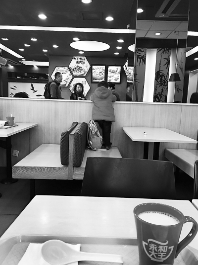 近日,在军博一处快餐店里,记者就看到了这样的一幕,一位带着孩子吃饭的妈妈先将孩子放在座位上,然后跑到餐厅的点餐台点餐。