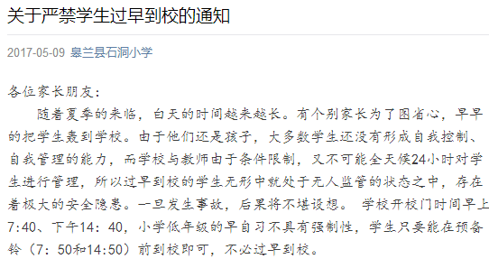 甘肃省皋兰县石洞小学《关于严禁学生过早到校的通知》。(截图)