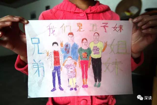 前段时间,衣伍木用画笔给兄弟姐妹们画了一张“全家福”,这耗费了她一天的时间。在画里,五姐弟每个人都穿着彩色的服装,她在画的周围也用彩笔写着:兄弟姐妹,我们是五子妹(注:四川话,姊妹,表示家里的兄弟姐妹)。两年前,在媒体记者给她们拍摄的众多家庭合影中,五姐弟的表情都显得有些无助和失落。但这次,在衣伍木的画里,五姐弟都是开心的笑脸,手里还比着V。