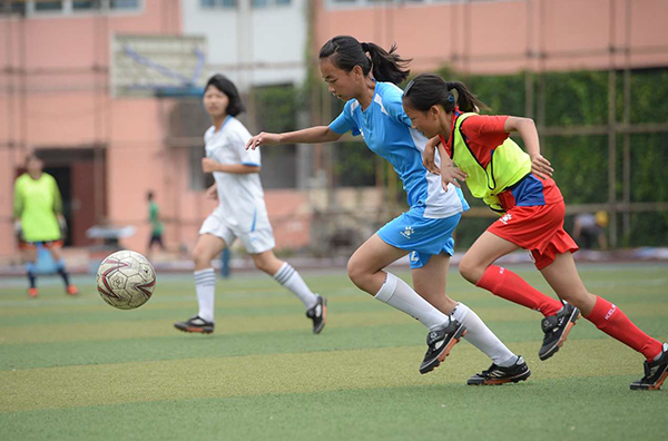 和盛小学六年级女子足球队与温江中学实验学校初中队的比赛正式开战,这是集训时的友谊赛,和盛小学正在为今年四川青少年足球锦标赛女子丙组备战。