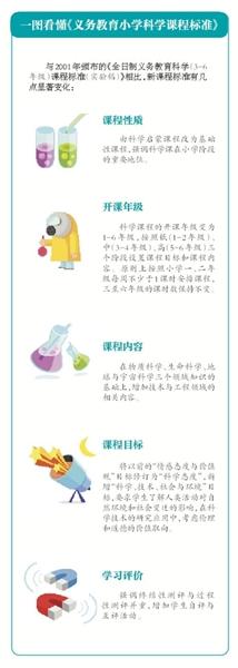 科学课程的开课年级变为1-6年级,按照低(1-2年级)、中(3-4年级)、高(5-6年级)三个阶段设置课程目标和课程内容。原则上按照小学一、二年级每周不少于1课时安排课程,三至六年级的课时数保持不变。