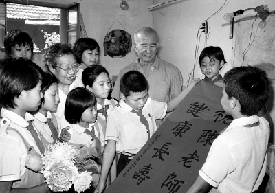 1985年教师节前夕,朝阳区三里屯三小的学生慰问“故事爷爷”孙敬修。杨金华/摄