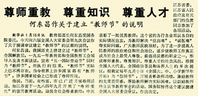 其实,这并非我国第一次提出“教师节”的概念。据本报1985年1月16日1版《何东昌作关于建立“教师节”的说明》一文记载,新中国成立后,1951年教育部和全国教育工会领导人发表书面谈话,宣布“五一国际劳动节”同时为“教师节”。但执行的结果是“教师节”实际上并不存在。