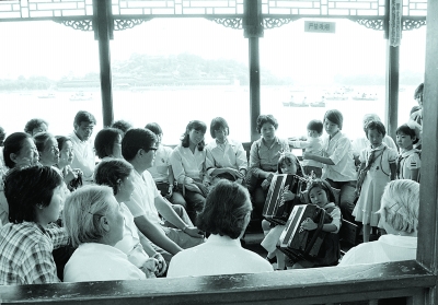 ▼1986年教师节前夕,东城区安定门街道举行游船联欢活动,慰问中小学和幼儿园教师。王振民/摄