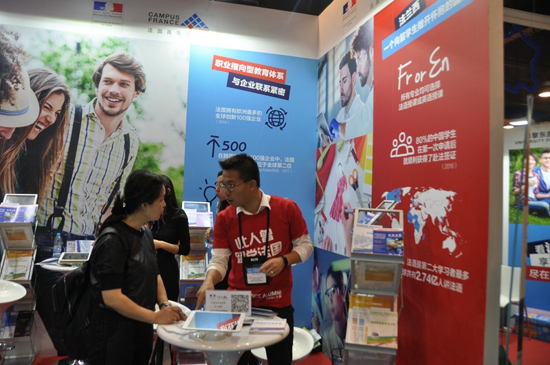 与其他国家不同,今年法国特设了“留法学友”板块,几位曾经在法国留学的学长和学姐,穿着印有“此人曾留学法国”的T恤,现场用自己的亲身经历为学生和家长提供帮助。