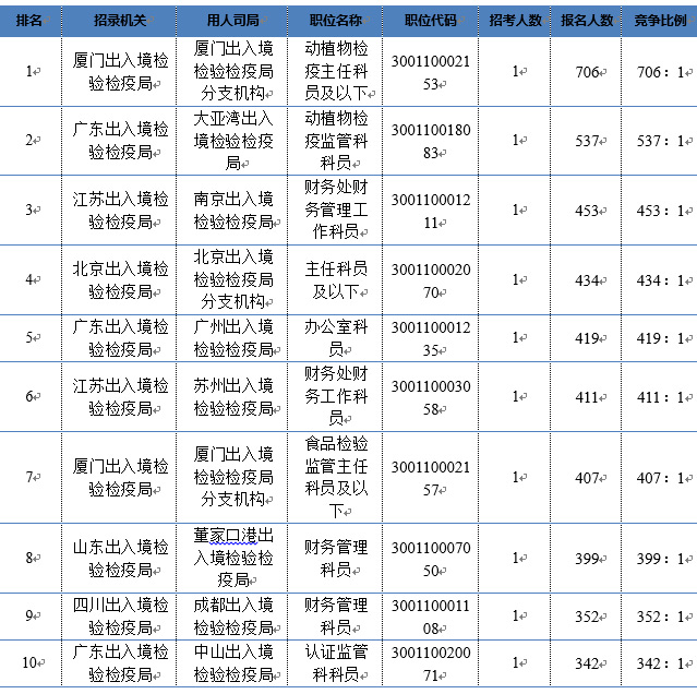 2018年国考出入境各部门竞争最激烈的十大职位(数据截至11月5日16:00)