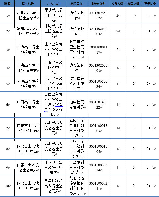 2018国考出入境各部门暂无人报考十大职位(数据截至11月5日16:00,按招录人数排名)