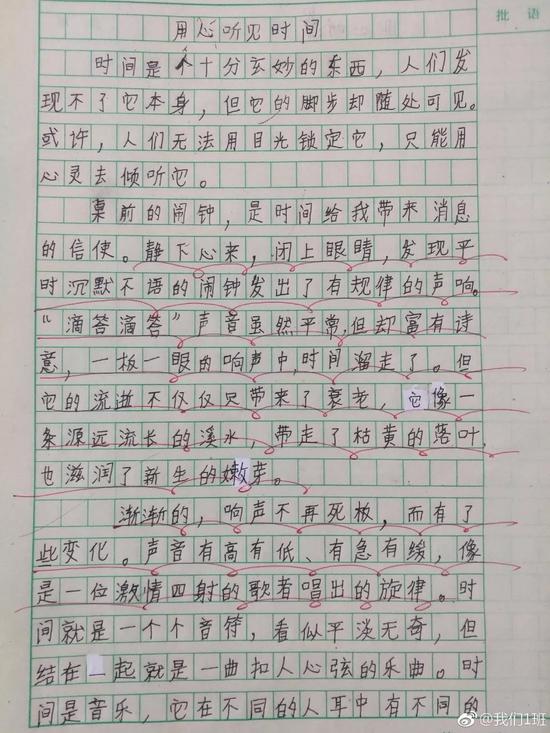 据说,这已经不是小邵第一次思考时间的意义的,之前他还写过一篇周记《用心听见时间》: