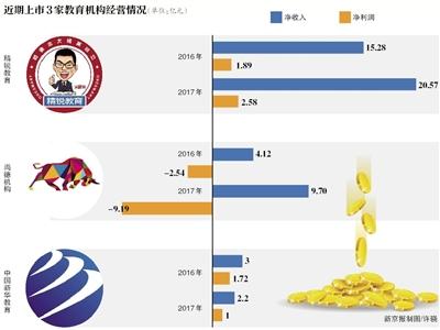 精锐教育创建于2007年,定位为向富裕家庭提供高端K12课后教育服务。2016年至2017年,精锐教育的总营收分别为15.28亿元、20.57亿元;净利润分别为1.89亿元、2.58亿元。
