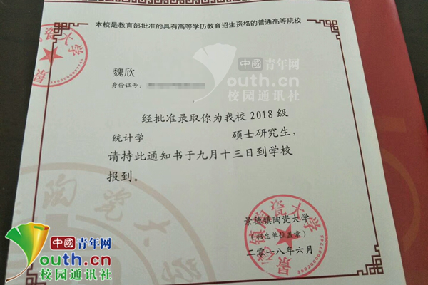 图为魏欣的研究生录取通知书。本人供图