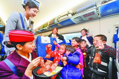1月24日,在重庆开往福州的G1755次列车上,乘务员和“小候鸟”做游戏。春运期间,大批务工人员子女随长辈踏上与父母团聚的旅途,南铁福州客运段提前对重点线路乘务组进行儿童陪护培训,在列车上准备了书本和玩具,用爱心护航“小候鸟”的团圆路。新华社记者 宋为伟摄