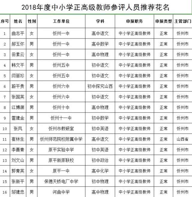 按照山西省人社厅、教育厅《关于2018年度全省中小学教师高级专业技术职务任职资格评审工作的通知》(晋人社厅函[2018]956号)要求,经市教育局、市人社局初审有曲志平等16人基本符合中小学正高级教师条件,拟向省高评委推荐申报,如有异议请在5个工作日(2月28日至3月6日)内向市纪委监委驻忻州市教育局纪检监察组或忻州市人社局专管科反映。