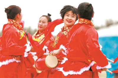 在江苏省淮安市盱眙县穆店镇大桥村,当地中学青年教师张昀(右二)与村民一起跳腰鼓。作为文艺志愿者,她经常下乡指导村民排练文艺节目,为丰富农村文化生活、助力乡村振兴贡献力量。周海军/摄