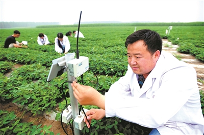 沈阳农业大学教师赵新华在调试土壤剖面水分测定系统。该校青年教师在完成课堂教学的同时,带领学生深入辽宁省阜新市彰武县西六家子乡的农大花生科研基地,将教学和科研相结合。张文魁/摄