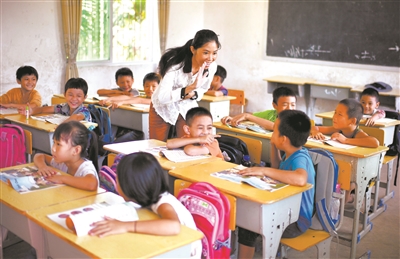 特岗乡村英语教师黄妮娜在海南省保亭黎族苗族自治县保城镇西坡小学给学生上英语课。6年前,她和同伴们来到保亭黎族苗族自治县山区,担负起乡村小学的英语教学任务。虽然条件艰苦、收入微薄,但他们心甘情愿地承担起这份责任。郭程/摄