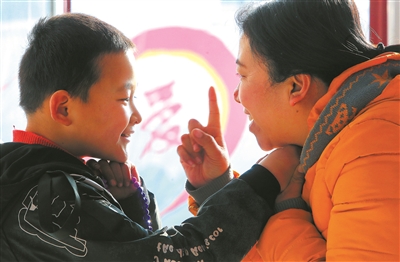 河北省张家口市宣化特教学校教师王艳红,让孩子用手感知正常发音时声带的振动频率,让聋障学生学习“说话”。张学军/摄