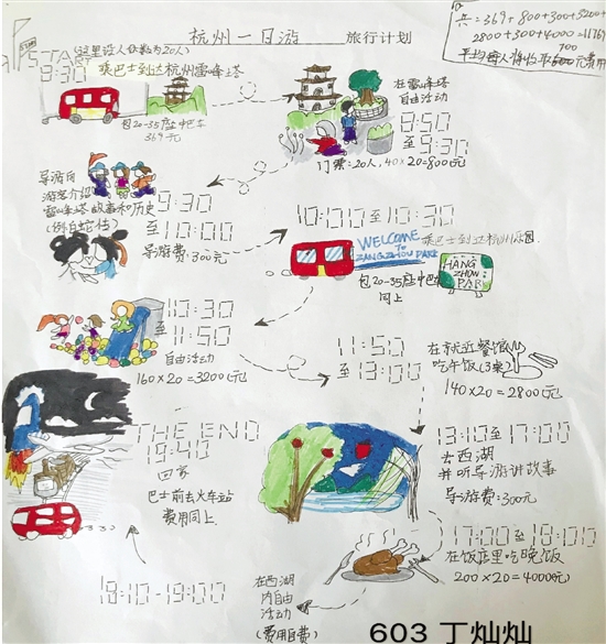 夏衍小学六年级数学备课组组长张涛告诉记者:“这一作业涉及六年级数学教材中的成本盈利问题,学生在制作旅行计划时可以体验成本的概念,同时能够培养更多的数学综合素养。”