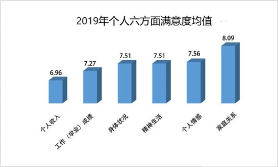 调查显示,以10分为满分,受访者在2019年个人家庭关系方面打分均值为8.09分,满意度最高,其次是个人情感方面,打分均值为7.56分,身体状况和精神生活方面的打分均为7.51分。