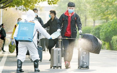 上午8时,郑州一中开始安排高三学生分批进校。17个班按照错时、分批进校的原则,从学校东门和南门分批进校。家长把学生送到路边,学生拖着大小行李,陆续通过通道。一旁的老师不时提醒:“注意保持间距。”